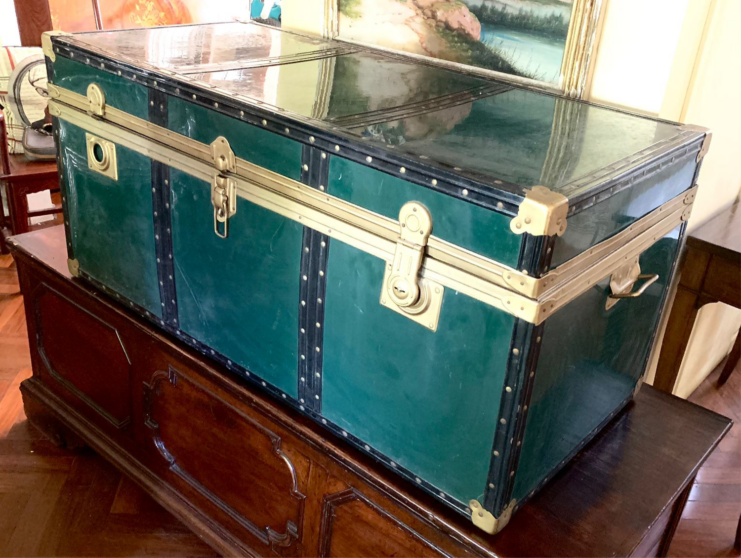 Elegante e capiente baule in alluminio dipinto, caratterizzato da una struttura solida con dettagli in metallo e angolari rinforzati. Il colore verde brillante, impreziosito da profili a contrasto e chiusure originali, dona al pezzo un fascino retrò e senza tempo.