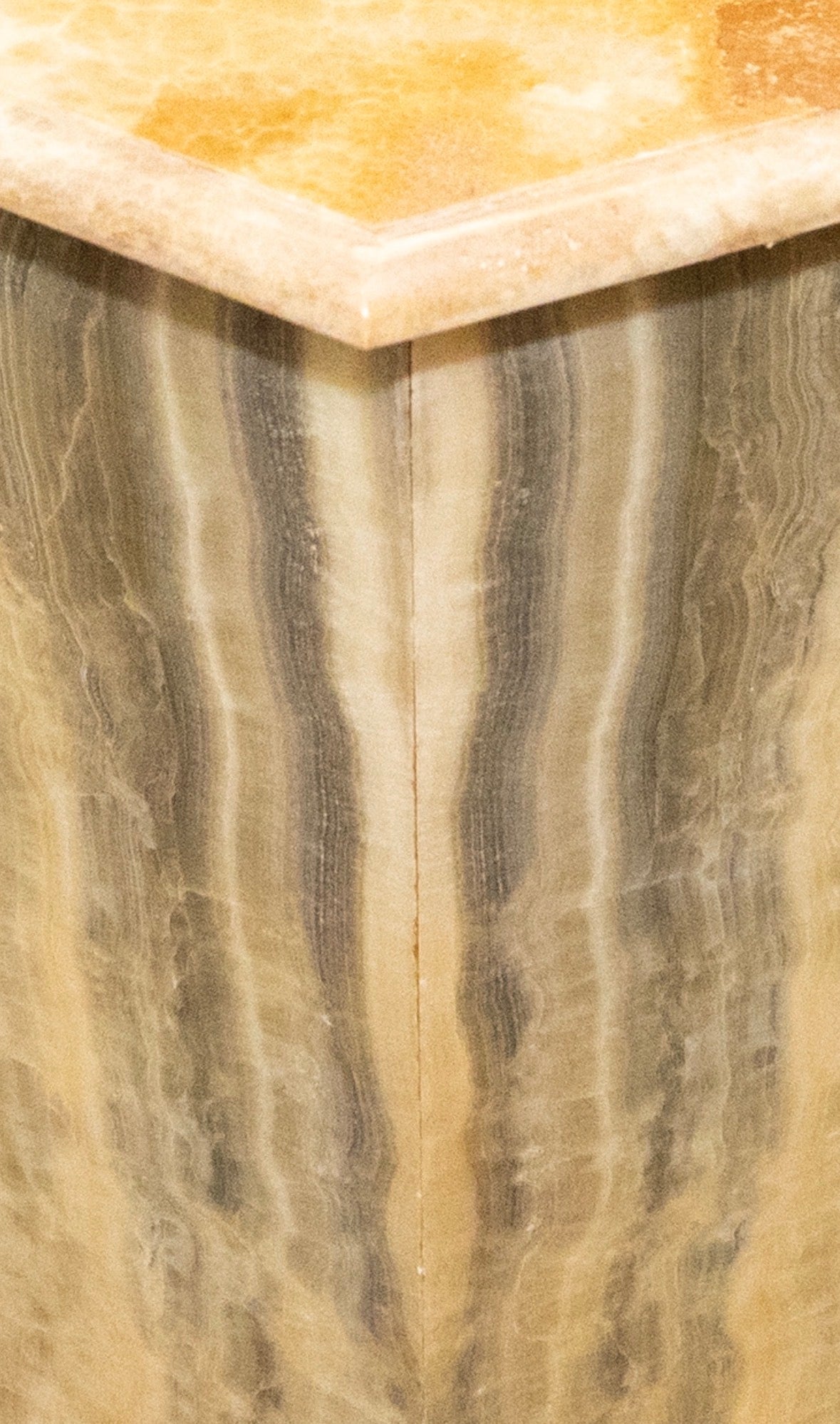 Elegante tavolino da caffè realizzato in onice francese (alabastro), caratterizzato da una raffinata forma esagonale e da una splendida venatura naturale nei toni caldi del miele, dell’ambra e del crema.
