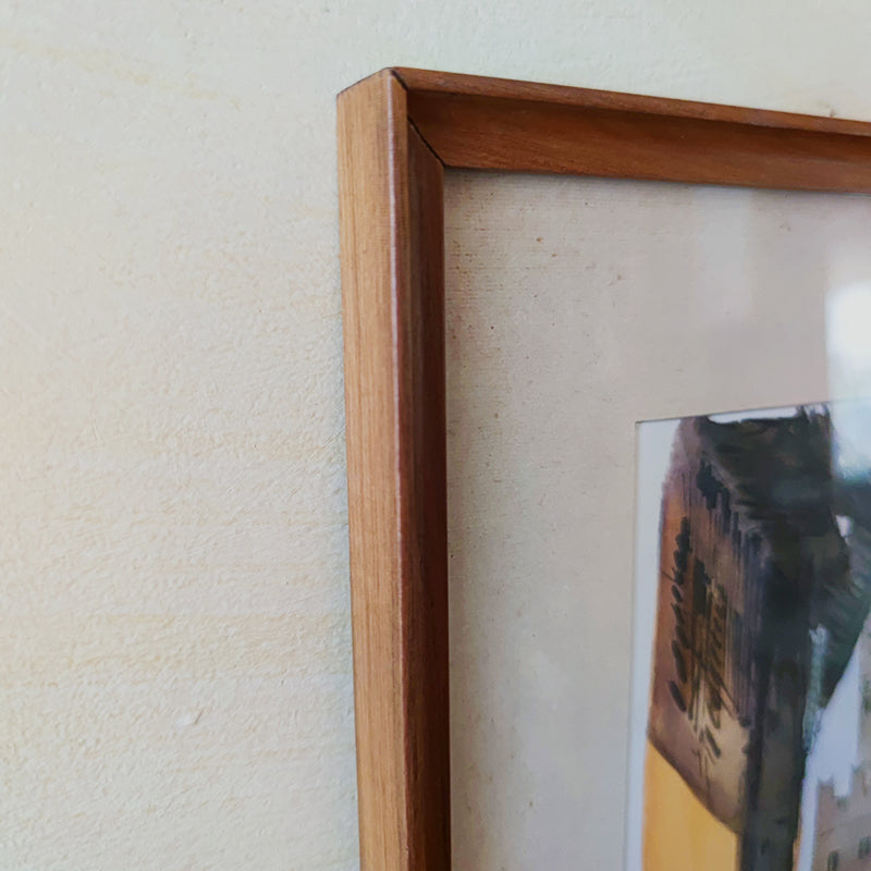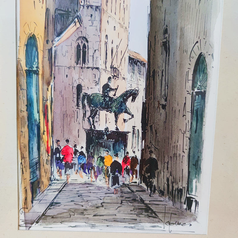 Stampa acquerellata con veduta del Palazzo Vecchio con la Torre di Arnolfo e la Statua equestre di Cosimo I de' Medici che si trovano in piazza della Signoria a Firenze.